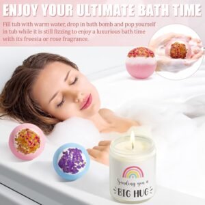 Relaxing Spa Gifts Our scented candle with the quote “Sending You a Big Hug” is made of pure plant essential oil and 100% natural soy wax, while our bath bombs come in rose fragrances. And soft fuzzy socks, smooth silk eye mask to take care of her sleep; satin hair tie for her make beautiful hairstyles. These items, along with the big hug mug, will help soothe the mind and relax the body.
