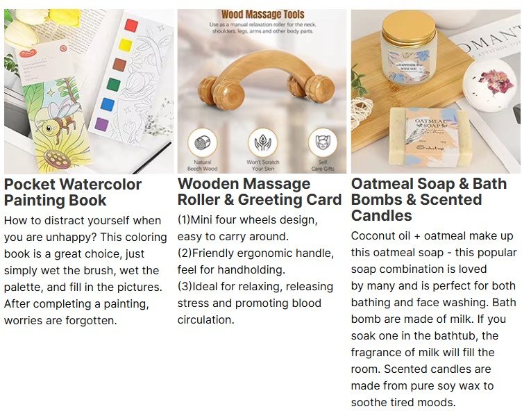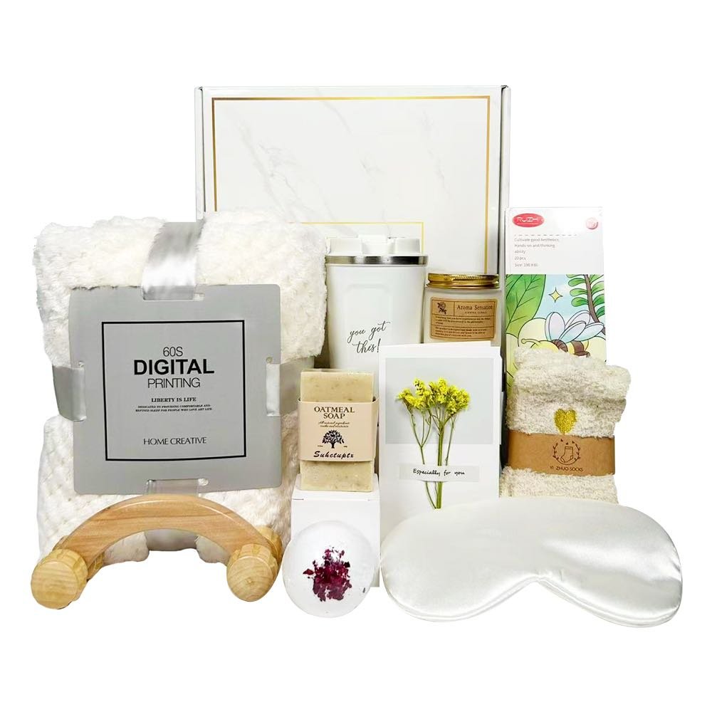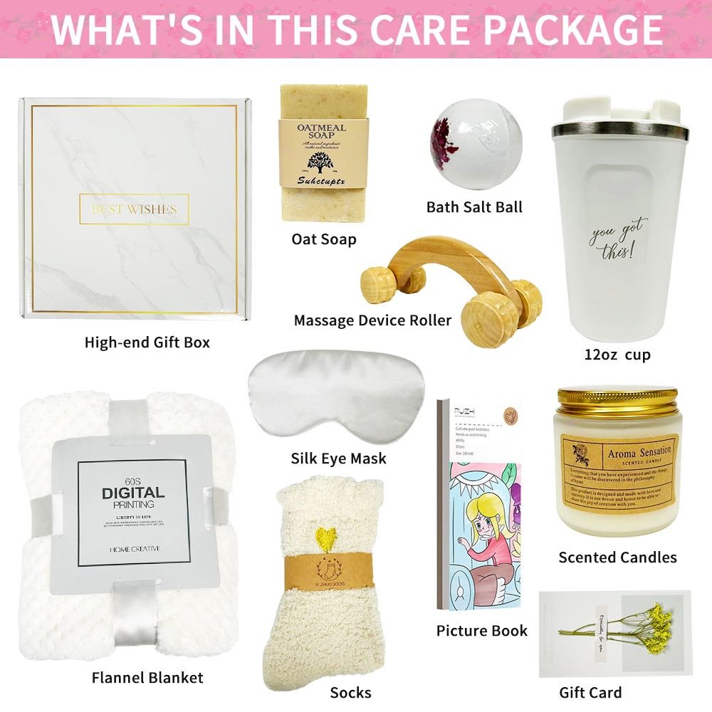 Warm Them Up With Our Hug In a Box I hope that friends who receive this gift baskets for women can feel our intentions in assembling and designing! Beautiful gift box in kraft paper with cheerful shades, a custom 10pcs care package with greeting card) is like sending a get well hug & love! This will make her a great day