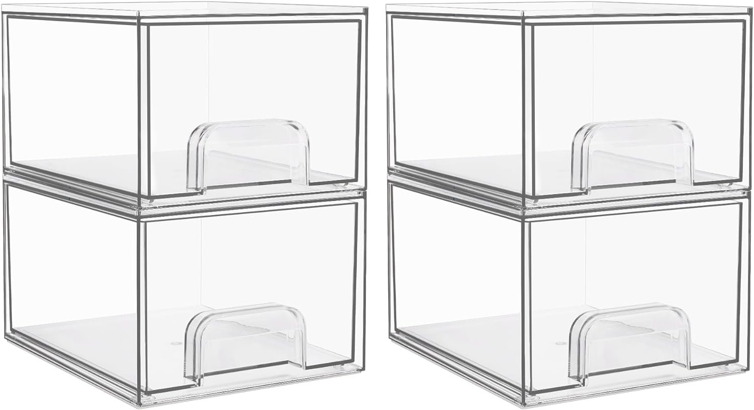 - [Stackable Design] Come with 4 drawer storage organizers, the outside box measures 7.5″D x 6″W x 4.4″H,the drawer measures 7.1″D x 5.6″W x 3.7″H,it is usable size. Please measure the space of using before purchasing.The storage containers are stackable, vertical storage will save a lot of space. You can also use them side by side. Put your small objects on top of acrylic bins to make your countertop space more tidy.