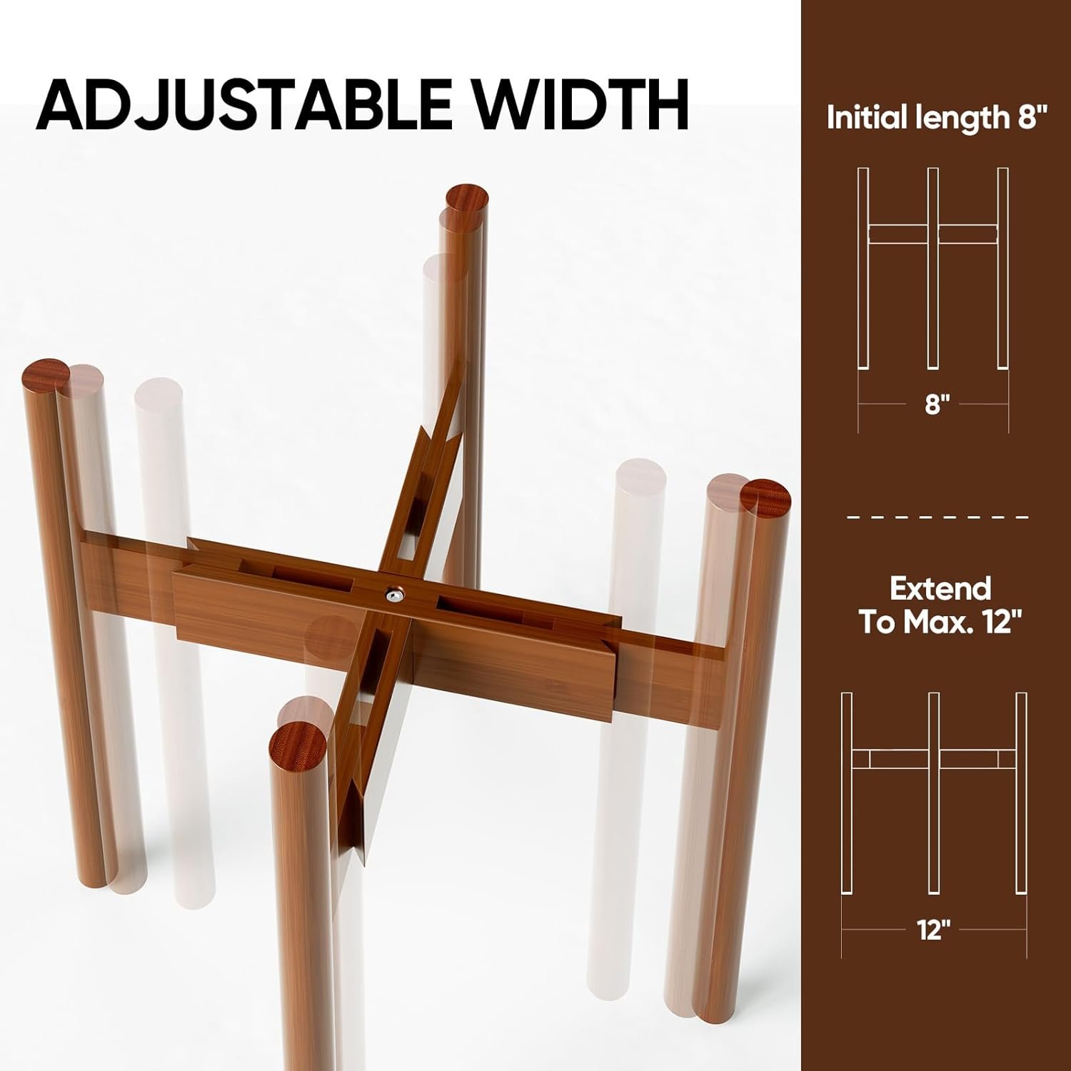- Adjustable Width Our indoor bamboo plant stand is adjustable from 8 to 12 inches in width; It fits pots in size of 8 9 10 11 12 inches; allowing you to place plant pots of different sizes; Pot and plant are not included