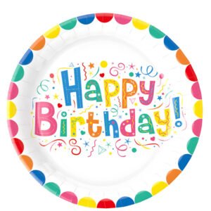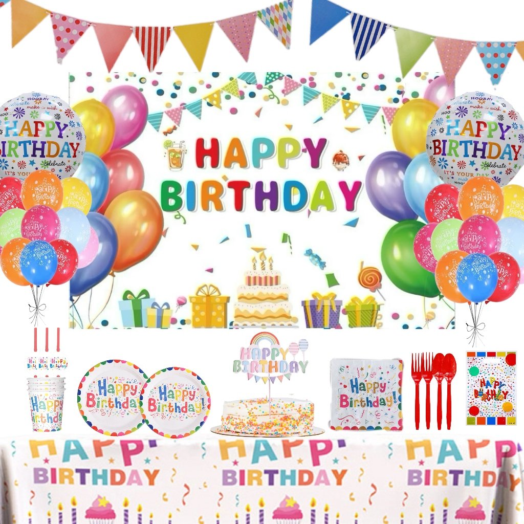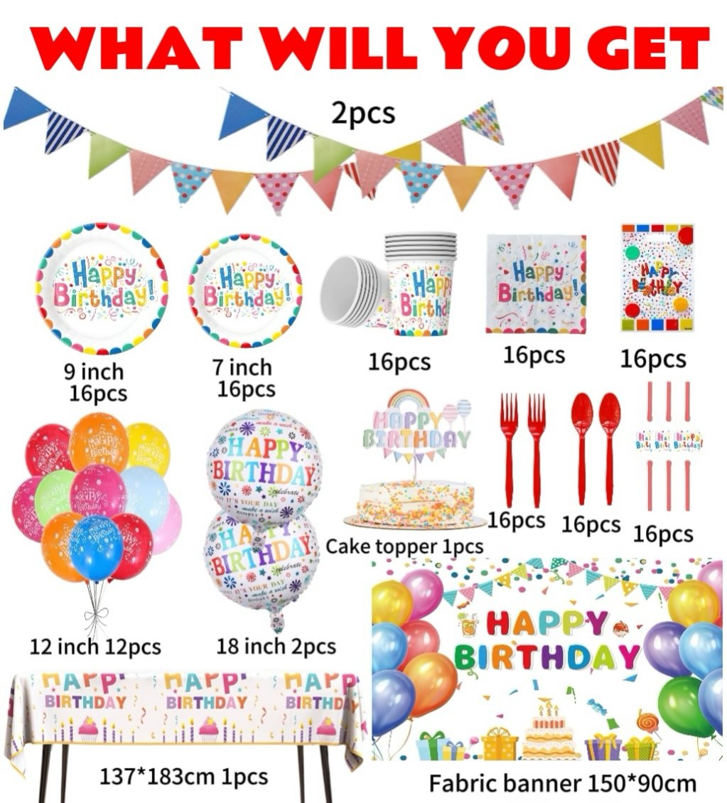 This All-in-One Colorful Birthday party pack serves 16 guests.