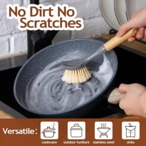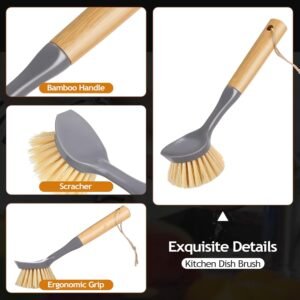 - Reliable Bristles: the kitchen dish brush has a sturdy body construction, long handle of dishwashing brush is made of bamboo and fibers, the bristles are durable, easy to tackle grease and grime, and will not scratch pots, etc., the gray part is made of plastic, cleaning brush is safe to use in cookware and tableware
