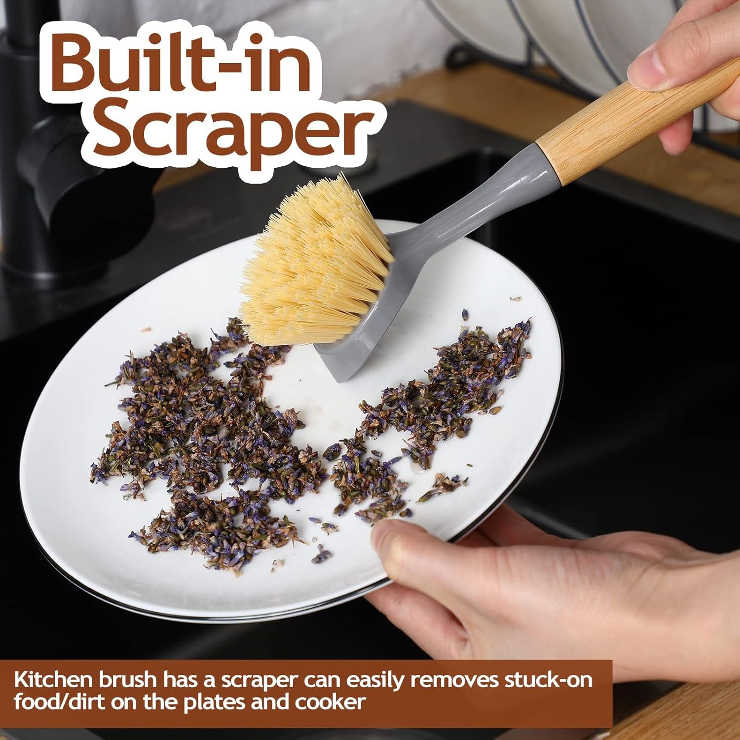 - Effortless to Hold: the kitchen scrub brush with a bamboo handle, with fine finish, smooth to touch and gives you comfortable hand feelings, easy to apply pressure for tough scrubbing; And built in scraper on kitchen brush head easily removes stuck on food, and dish scrubber’s handle has hanging cord to hang on wall, and air drying to storage