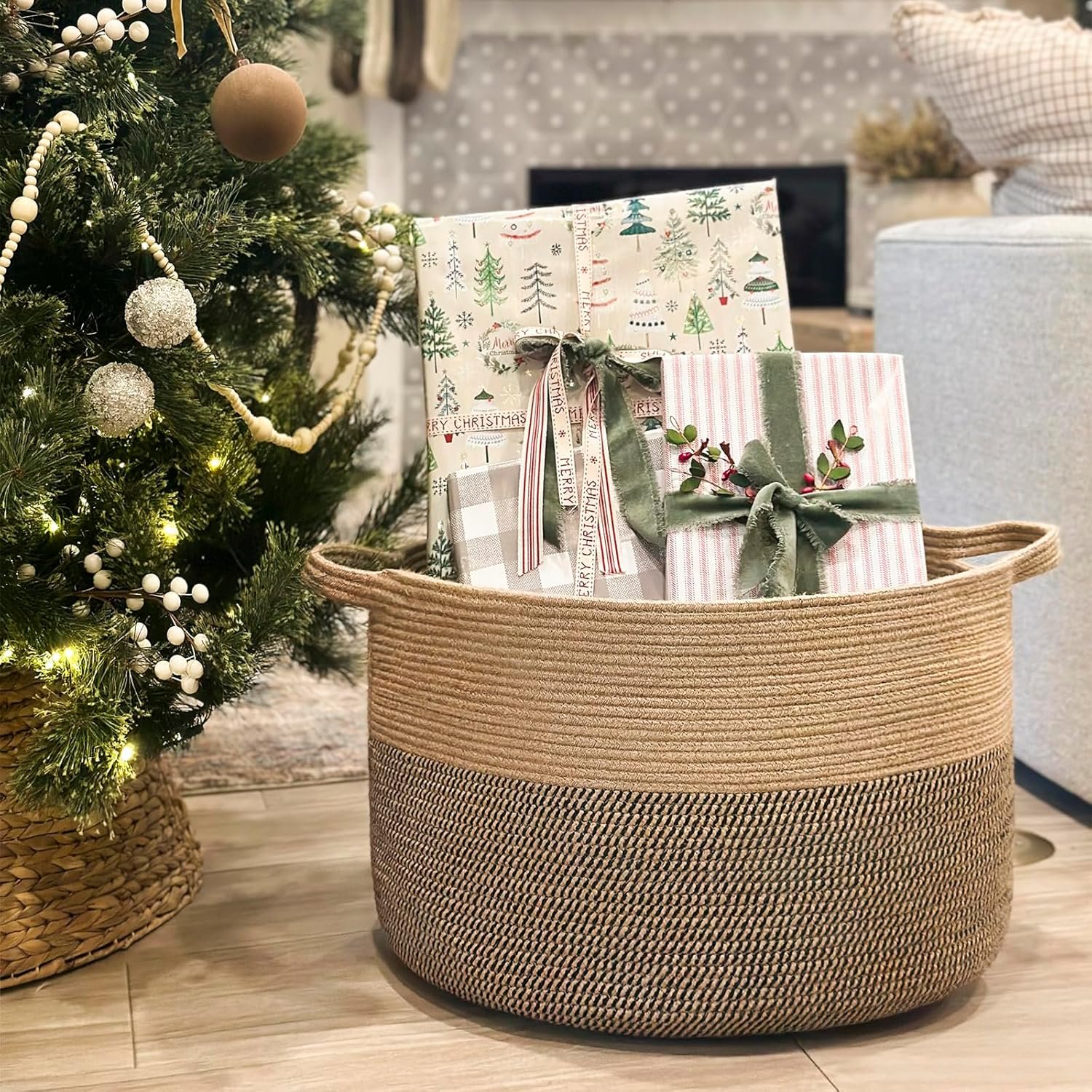 - Handle Design. This jute basket is designed with two large easy-to-grab handles for maximum portability, which allows you to move the basket around your home with ease